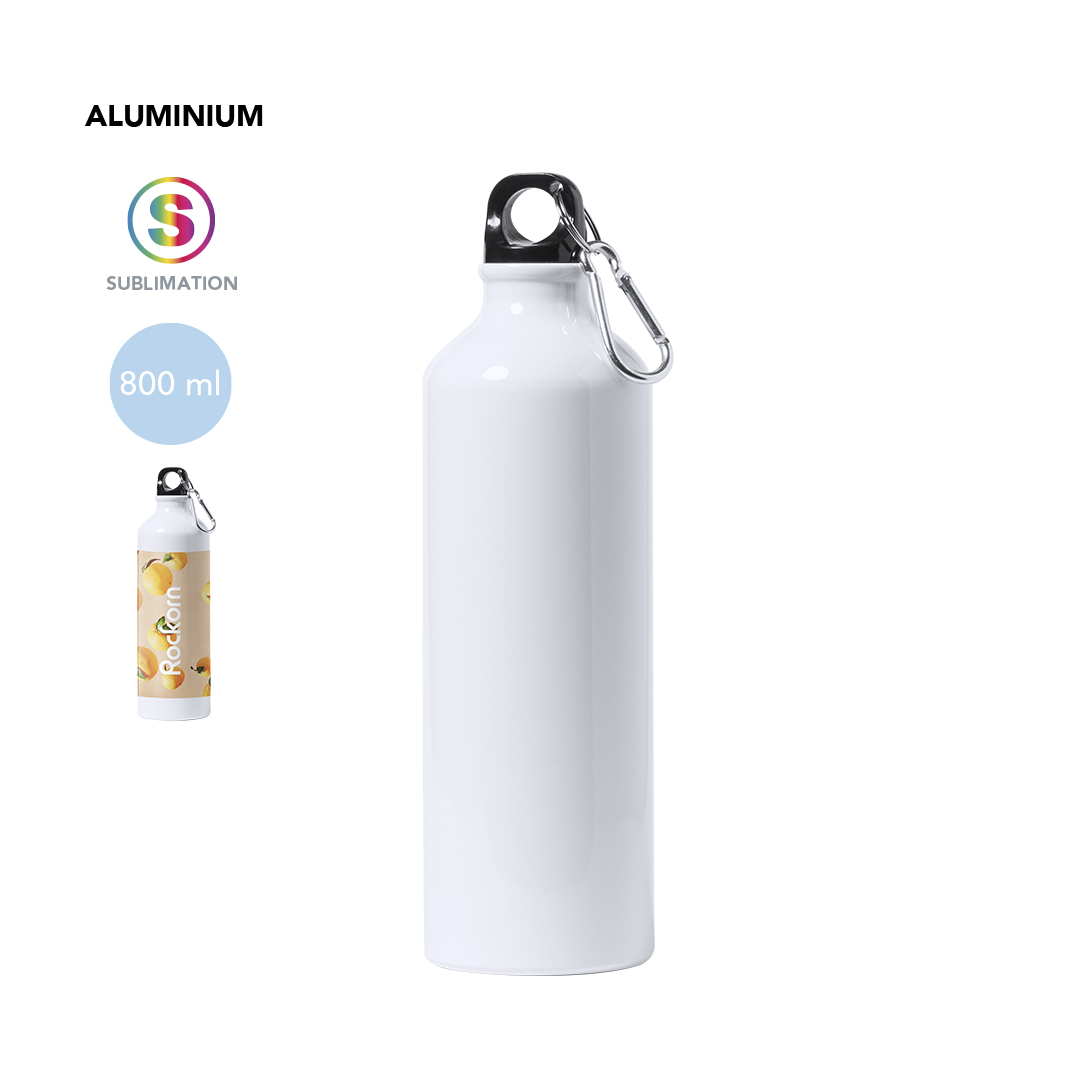 Bidón blanco personalizable de 800 ml con tapón de rosca y mosquetón metálico. Ideal para deporte, trabajo y actividades al aire libre.