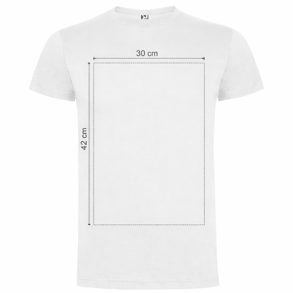 Camiseta blanca específica para hombre o mujer, de 100% algodón y 180g. Personalizable a todo color en una cara.